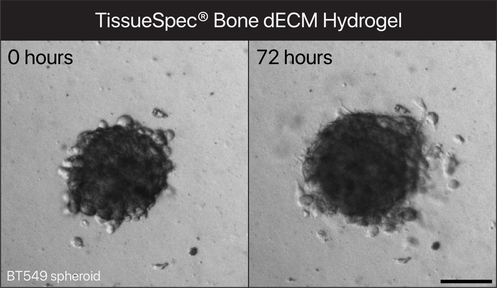 TissueSpec® Bone dECM Hydrogel (6 mg/mL) was used to model breast-to-bone metastasis in 3D with triple-negative BT549 human breast cancer spheroids embedded in bone-derived extracellular matrix for 72 hours. Scale bar = 100 µm.