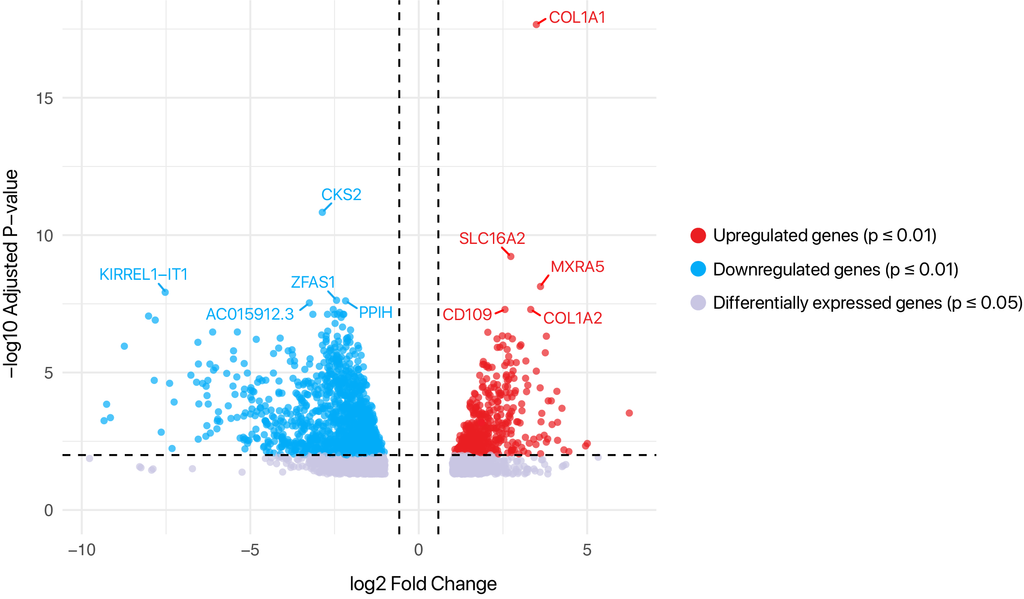 Volcano plot illustrating differential gene expression between BT549 human breast cancer spheroids cultured in TissueSpec® Lung dECM Hydrogel versus Matrigel. Red dots represent significantly upregulated genes (p ≤ 0.01), blue dots indicate significantly downregulated genes (p ≤ 0.01), and purple dots denote genes meeting the overall threshold for differential expression (p ≤ 0.05). Notable genes enriched in TissueSpec® Lung dECM Hydrogel include COL1A1, MXRA5, CD109, and SLC16A2, while CKS2, ZFA1, and KIRREL-IT1 were among the most downregulated.