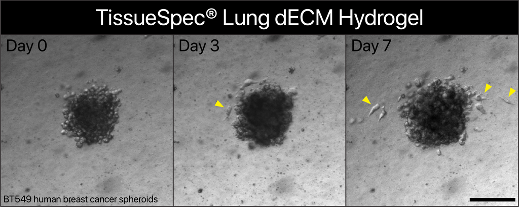 BT549 human breast cancer spheroids were embedded in TissueSpec® Lung dECM Hydrogel to model cell invasion in a secondary site of metastasis and for subsequent transcriptomic analysis. Breast cancer spheroids were imaged at Day 0, 3, and 7. Yellow arrowheads denote tumor cells that have disseminated from the spheroid to initiate invasion into the surrounding lung dECM microenvironment. Scale bar = 100 µm.